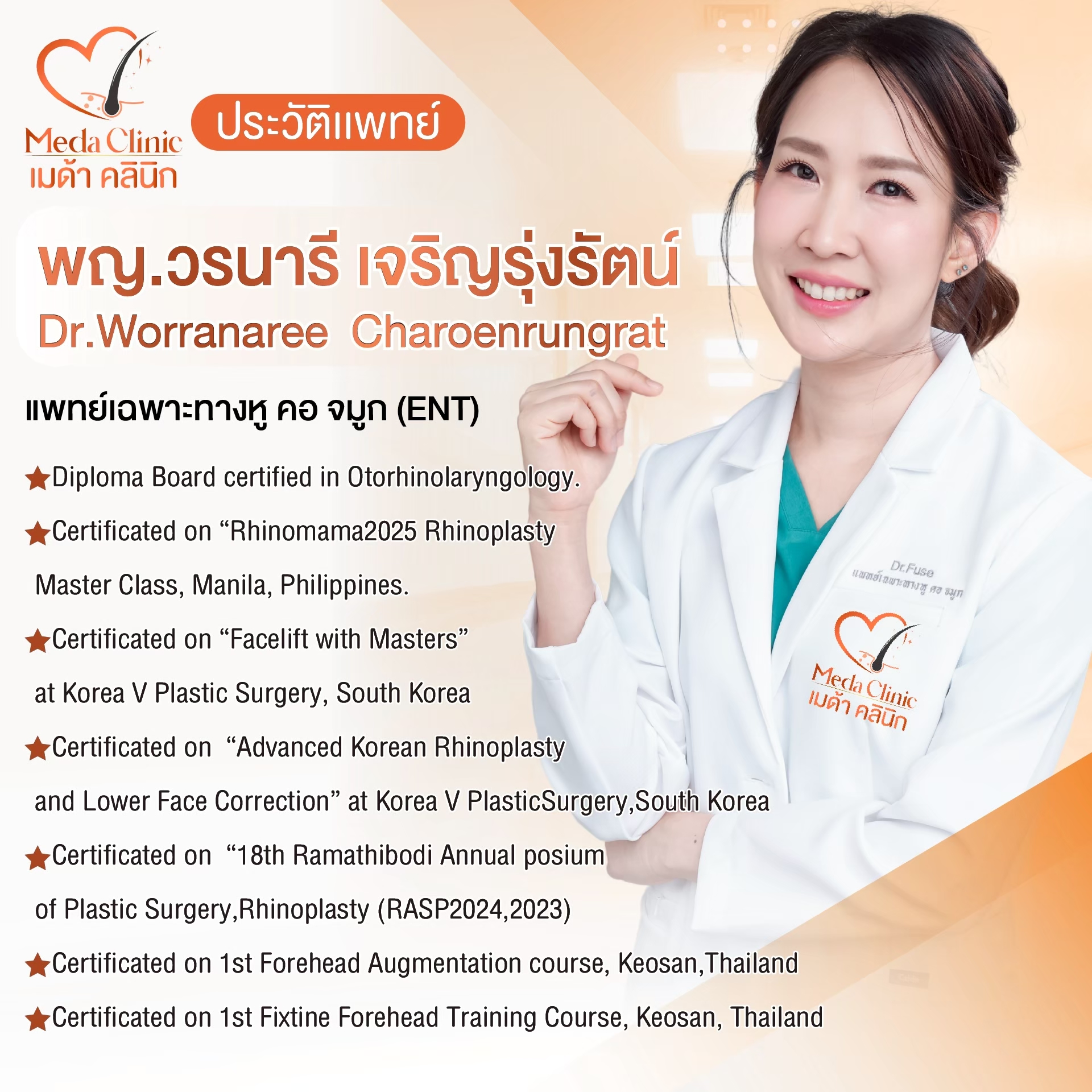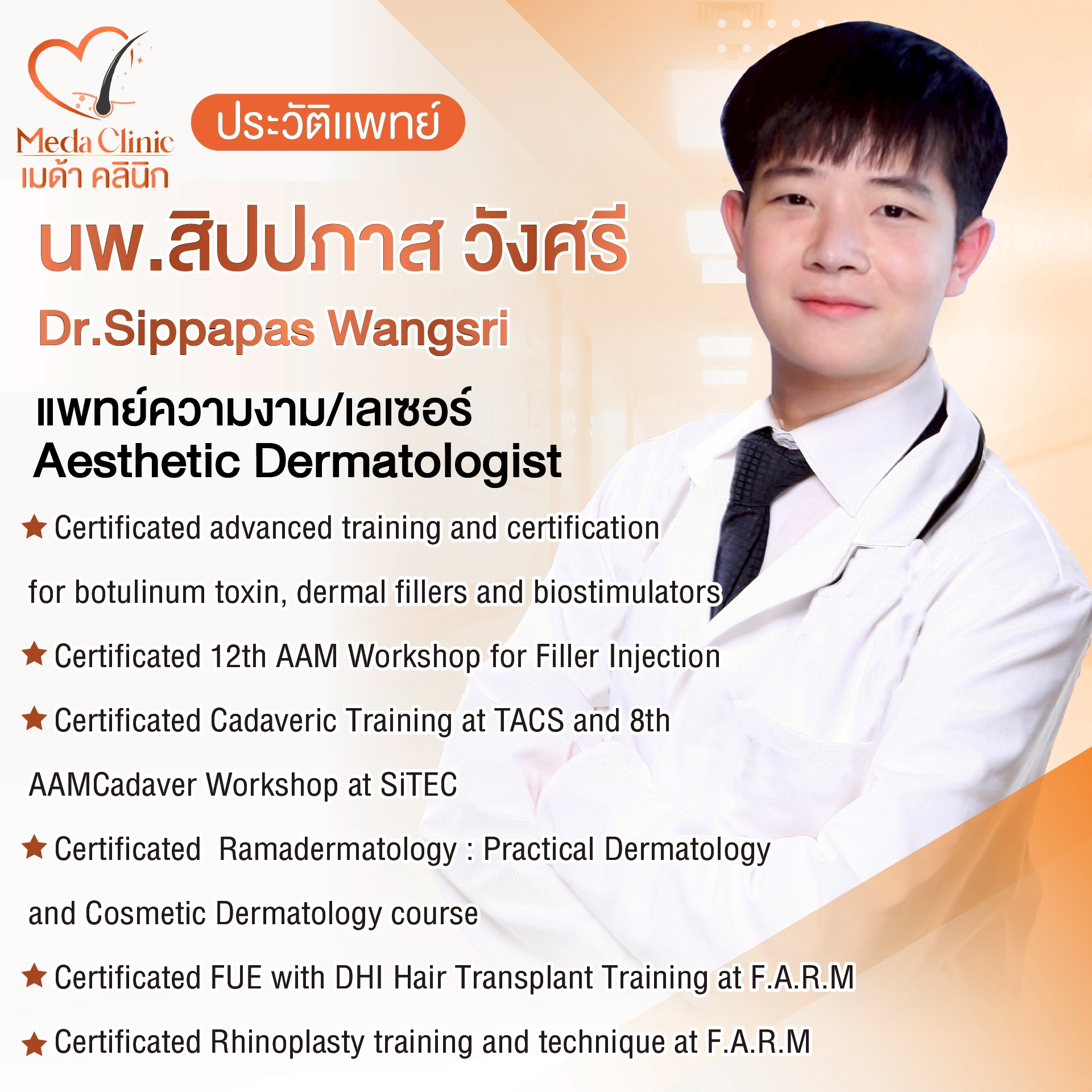 อาจารย์พิเศษ Dermatology and Regenerative medicine สำนักเวชศาสตรชะลอวัย ม.แม่ฟ้าหลวง / แพทย์ปริญญาเอก สาขา ผิวหนัง ศัลยกรรมผิวหนัง/เลเซอร์/ความงาม
