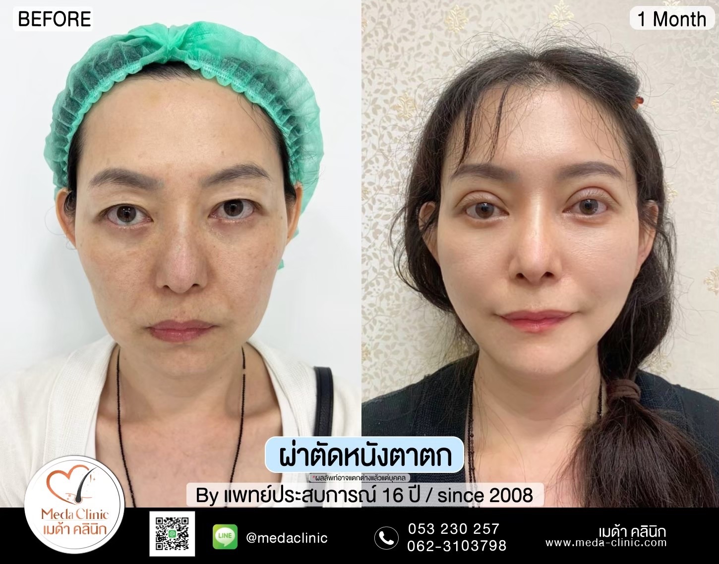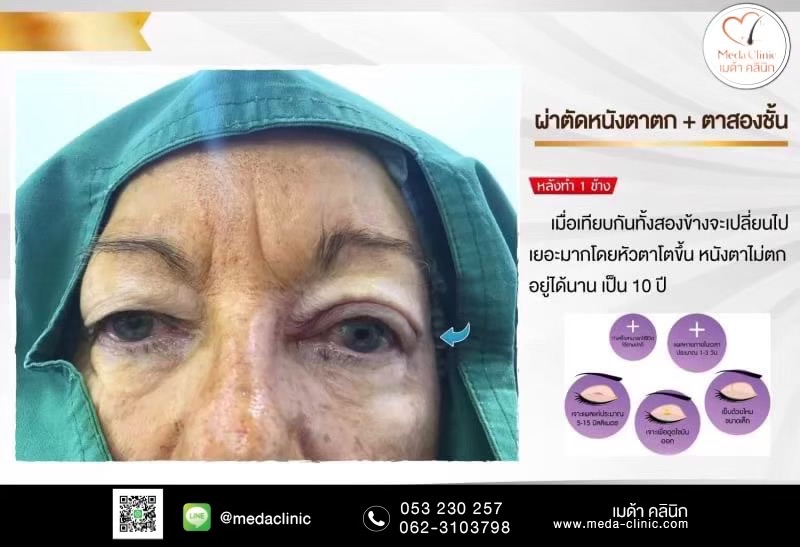 • วิธีทำ: กรีดชั้นตา ตัดไขมันและผิวหนังส่วนเกินออก แล้วเย็บสร้างชั้นตาใหม่